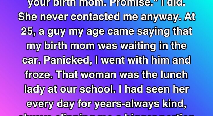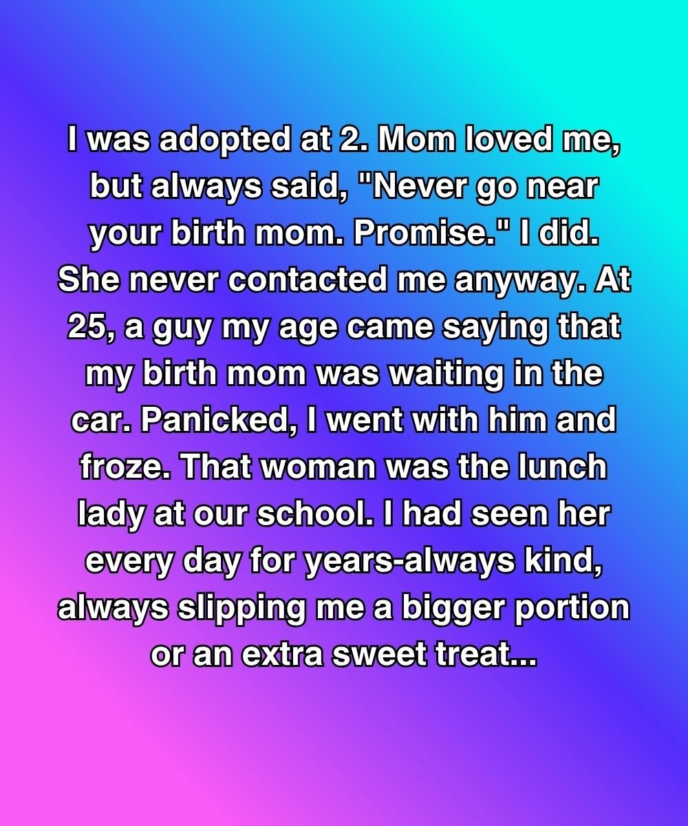 I was adopted at 2. Mom loved me, but always said, “Never go near your birth mom. Promise.” I did. She never contacted me anyway. At 25, a guy my age came saying that my birth mom was waiting in the car. Panicked, I went with him and froze. That woman was the lunch lady at our school. I had seen her every day for years—always kind, always slipping me a bigger portion or an extra sweet treat…